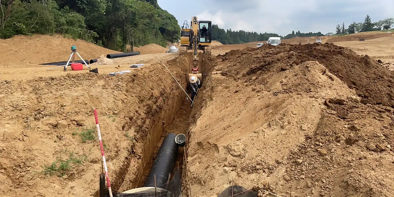 ゴルフ場工事における基幹排水は、コース全体の水はけを左右する最も重要な設備の一つです。降雨時の水たまりや地下水の滞留を防ぐことで、フェアウェイやグリーンのぬかるみを抑え、芝生の健全な育成とプレー環境の維持に大きく貢献します。適切な排水計画がなされていないと、芝の病害リスクが高まり、コースの利用制限や管理コスト増加の原因にもなります。基幹排水の整備は、ゴルフ場の価値と品質を長期的に守るために欠かせない工事です。