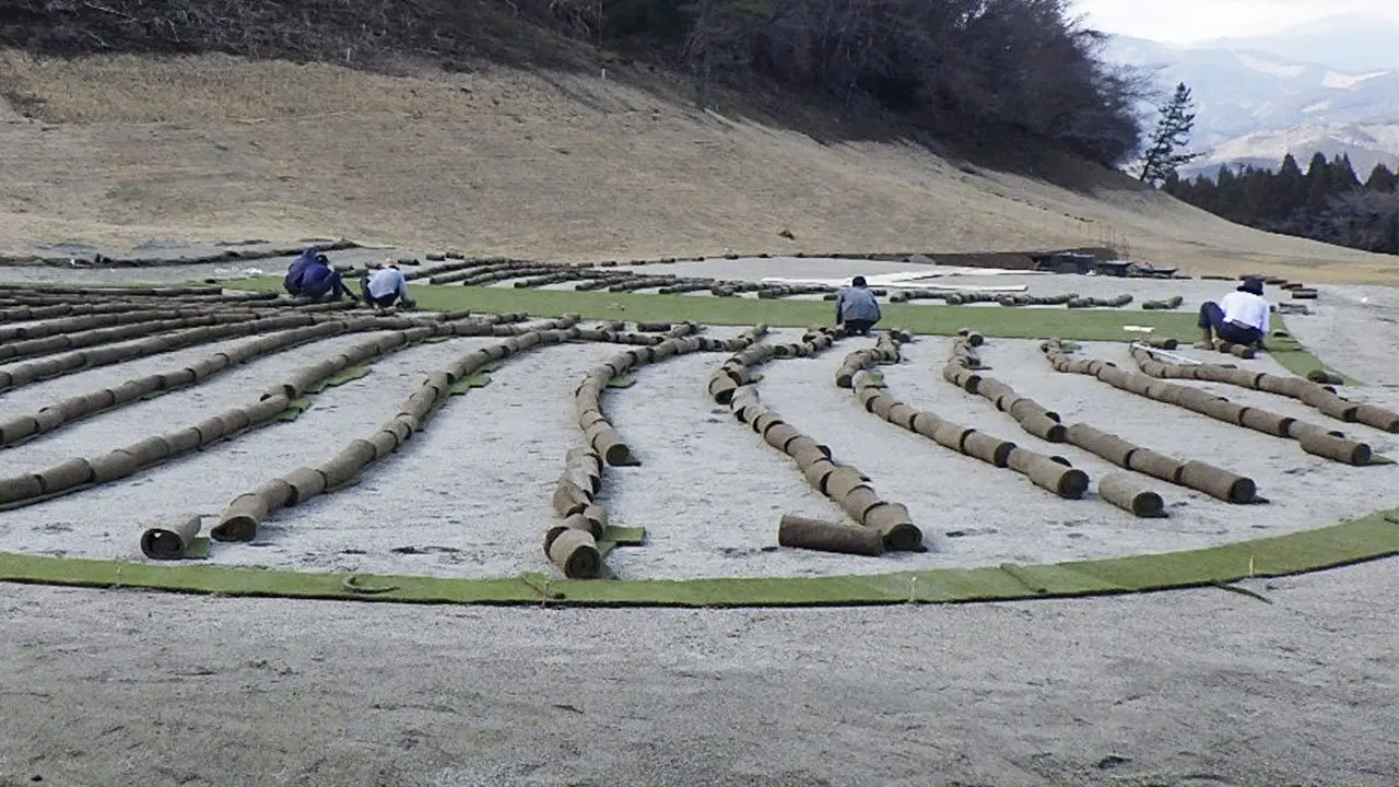 ビックロール張芝工は、幅の広いロール状の芝を用いて効率的に広範囲を施工できる工法です。従来のベタ張りに比べて継ぎ目が少なく、仕上がりが美しく均一になることが特長です。当社では、下地の整正や転圧、排水処理をしっかり行った上で、専用機械を使い正確かつスピーディに施工します。施工後の転圧や目土入れ、散水管理も徹底し、早期活着と高い耐久性を実現。競技場や公園など様々な現場に対応可能です。