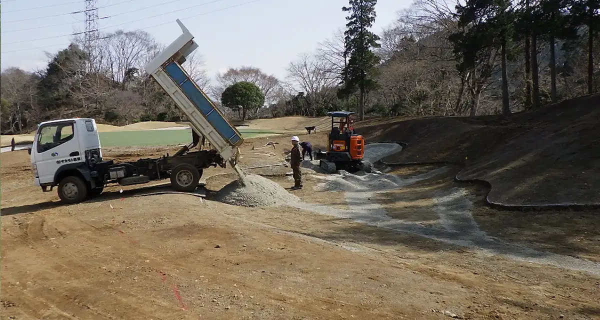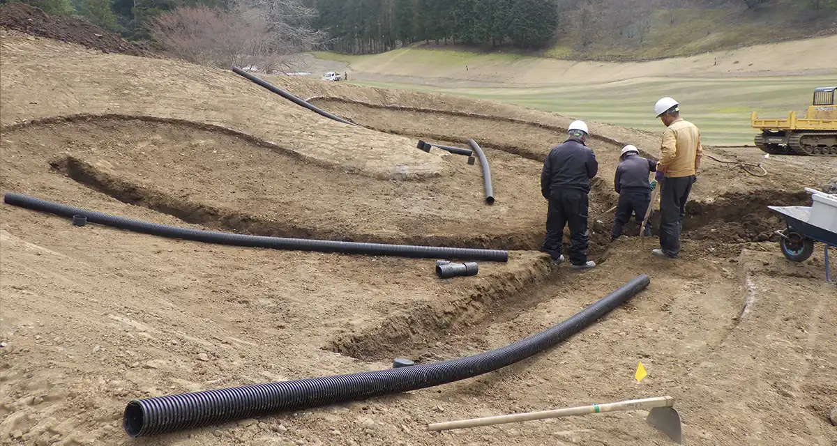 雨天時に降った雨水が排水されずにバンカー内に水が溜まってしまっているとの相談をいただき、バンカーの暗渠排水設備を確認いたしました。排水性を強化するため、砂の下に排水パイプを新たに設置し、砂と土壌の間に高排水性の資材を敷設いたしました。
